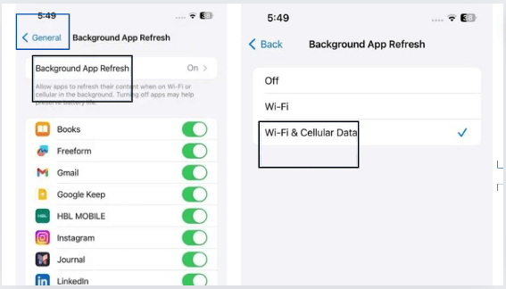 Krok 1:Přejít naNastavení > Obecné > Aktualizace aplikace na pozadí >Nastavte tona „Wifi a mobilní data“
