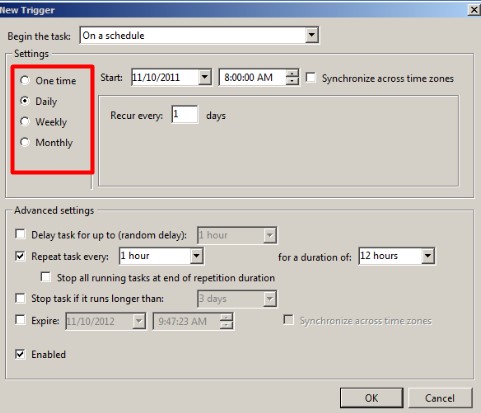 - Na stránce uvidíte otázku nakdyž chcete, aby úkol začal; vyberte libovolnou z možností pro automatické spuštění úlohy. Možnosti zahrnujídenní,týdně, měsíčně,jednou,když se počítač spustí, když se přihlásíma když je přihlášena konkrétní událost.