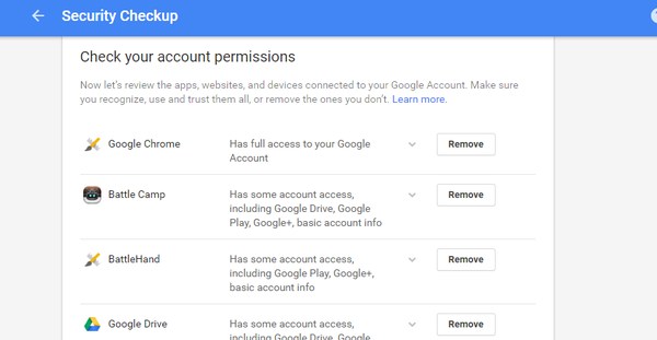 Krok č. 3 Zkontrolujte oprávnění účtu:Zde uvidíte všechna oprávnění, která jste udělili aplikacím a službám třetích stran pro přístup k vašemu účtu. Klikněte na „Odstranit“ vedle každé služby, kterou již nepoužíváte nebo kterou vůbec nepoznáváte.
