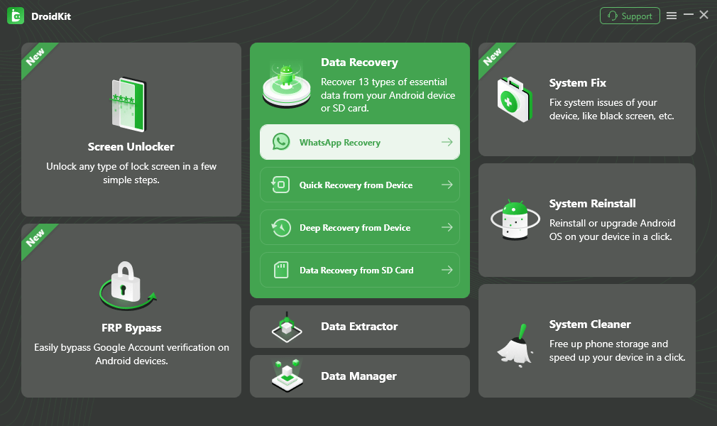 DroidKitje komplexní nástroj pro správu Androidu. Díky výzkumu týmu odborníků je schopen obnovit data WhatsApp tím nejbezpečnějším a nejrychlejším způsobem.Zde jsou jeho klíčové vlastnosti: