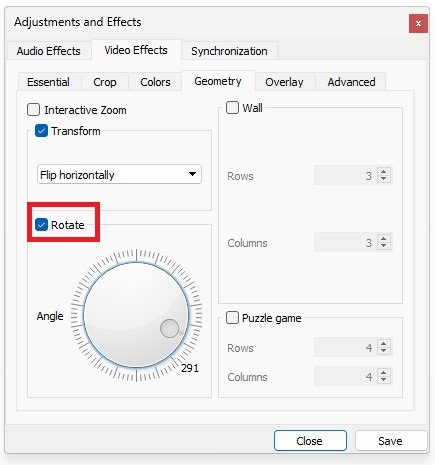 VÚpravy a efektyokno, ujistěte se, že jste vVideo efektysekce a pokračujte doGeometrietab. Nejprve máte možnost povolitTransformace. To vám umožní otočit video o 90, 180 nebo 270 stupňů. Máte také možnost převrátit video.