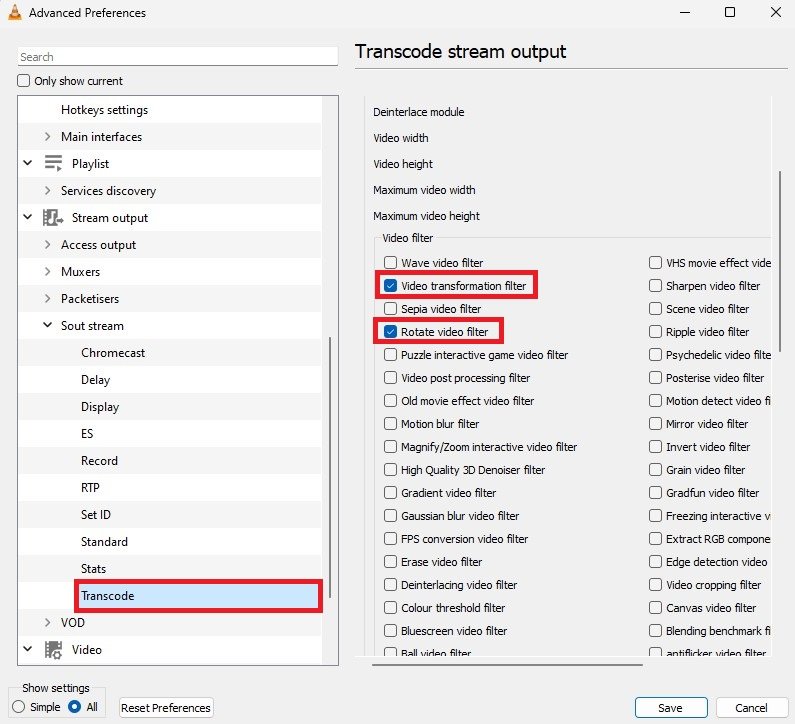 V levé dolní části tohoto okna se ujistěte, žeZobrazit nastavenímožnost je nastavena naVše. Dále přejděte naStreamový výstup>Sout Stream>Překódovat. PodVideo filtr, povolteOtočit video filtraFiltr transformace videamožnosti před uložením změn.