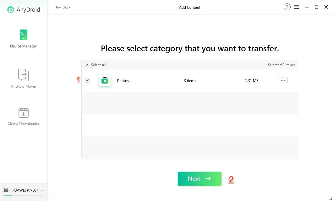 Zkontrolujte položky > Kliknutím na tlačítko Další přenesete fotografie z počítače do systému Android bezdrátově.