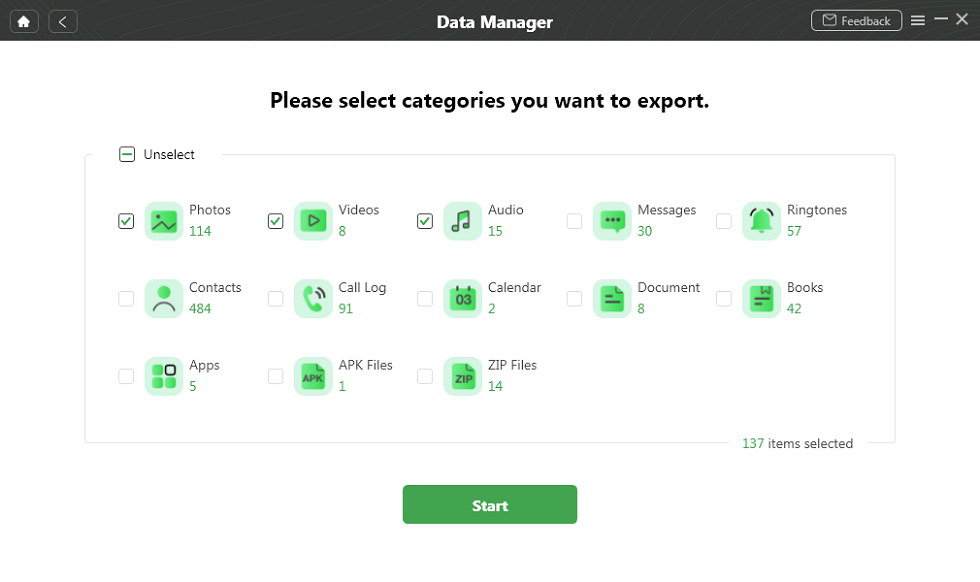- Nejširší pokrytí typů souborů.Podporuje přenos více než 20 kategorií souborů, včetně fotografií, kontaktů, zpráv, videí, kalendářů atd. Bez ohledu na to, co chcete přenést, pomůže vám to snadno provést.