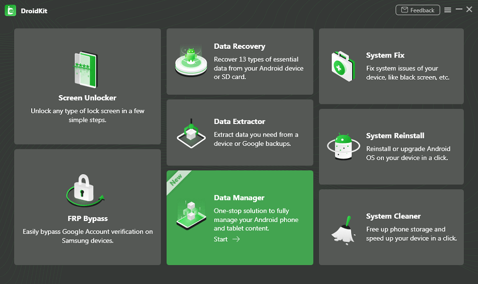 Získejte nejnovější verzi DroidKit na PC/Mac. Spusťte software a vyberte Správce dat.