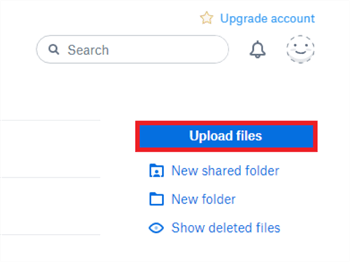 Přejděte na stránku dropbox.com a přihlaste se pomocí svého účtu Dropbox > Klikněte na tlačítko „Nahrát soubory“ nahoře.
