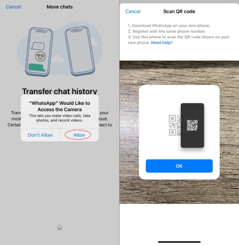Krok 4.KlepnětePovolitpovolit „WhatsApp chce přístup k fotoaparátu“. Poté budete moci naskenovat QR kód na svém novém iPhonu pomocí fotoaparátu na starém iPhonu.