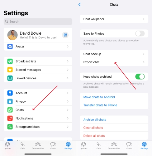 Krok 2KlepněteChaty > Exportovat chata vyberte chaty, které chcete přenést.