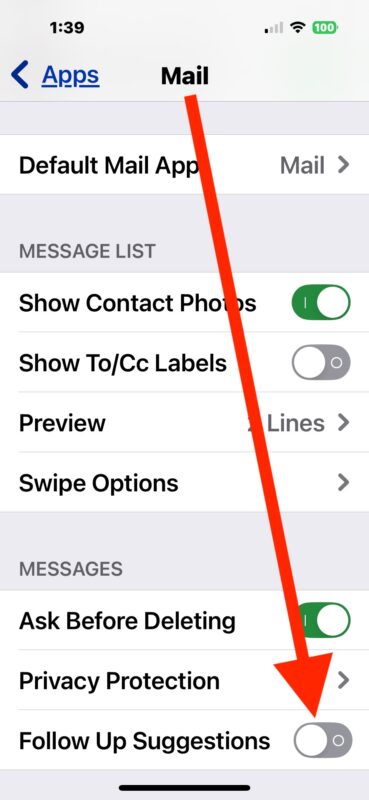 Chcete-li zabránit tomu, aby se staré e-maily zobrazovaly v horní části vaší doručené pošty na iPhonu nebo iPadu s odznakem „Následovat“, můžete deaktivovat funkci Návrhy sledování.