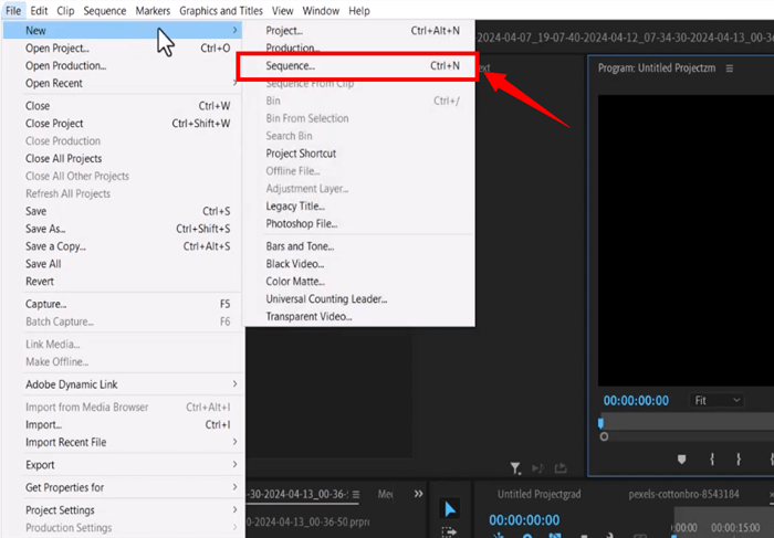 Přejděte na „Soubor“ a najeďte myší na „Nový“. Poté klikněte na „Sekvence“ ze seznamu možností.