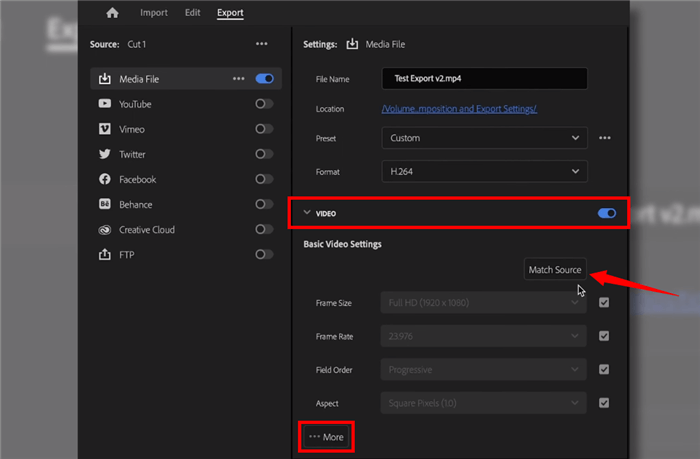 Otevřete panel „Video“ a kliknutím na „Match Source“ přiřaďte video k nastavení sekvence. Klikněte na „Více“ a zaškrtněte „Vykreslit v maximální hloubce“ a „Použít maximální kvalitu vykreslení“.