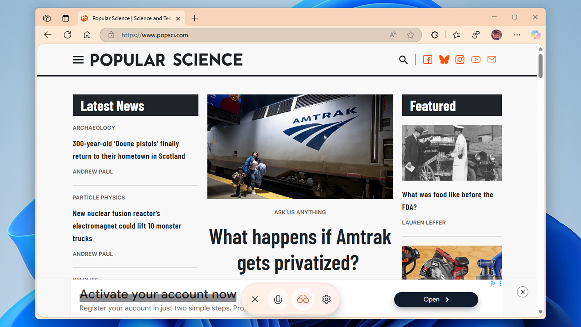 Poté musíte na kartě prohlížeče přejít na webovou stránku, video nebo soubor PDF, o kterém chcete chatovat s Copilot Vision. (Uvědomte si, že AI se odmítne zapojit do webových stránek obsahujících škodlivý obsah nebo obsah pro dospělé.) Spusťte Copilota kliknutím na ikonu Copilot, která je zcela vpravo na panelu nástrojů (napravo od tří teček).