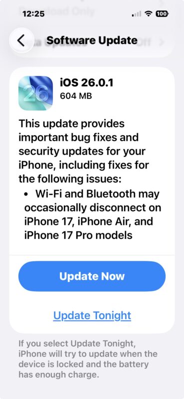 Aktualizace iOS 26.0.1 je relativně malá a měla by se nainstalovat rychle, ale k dokončení jako obvykle vyžaduje restart zařízení.