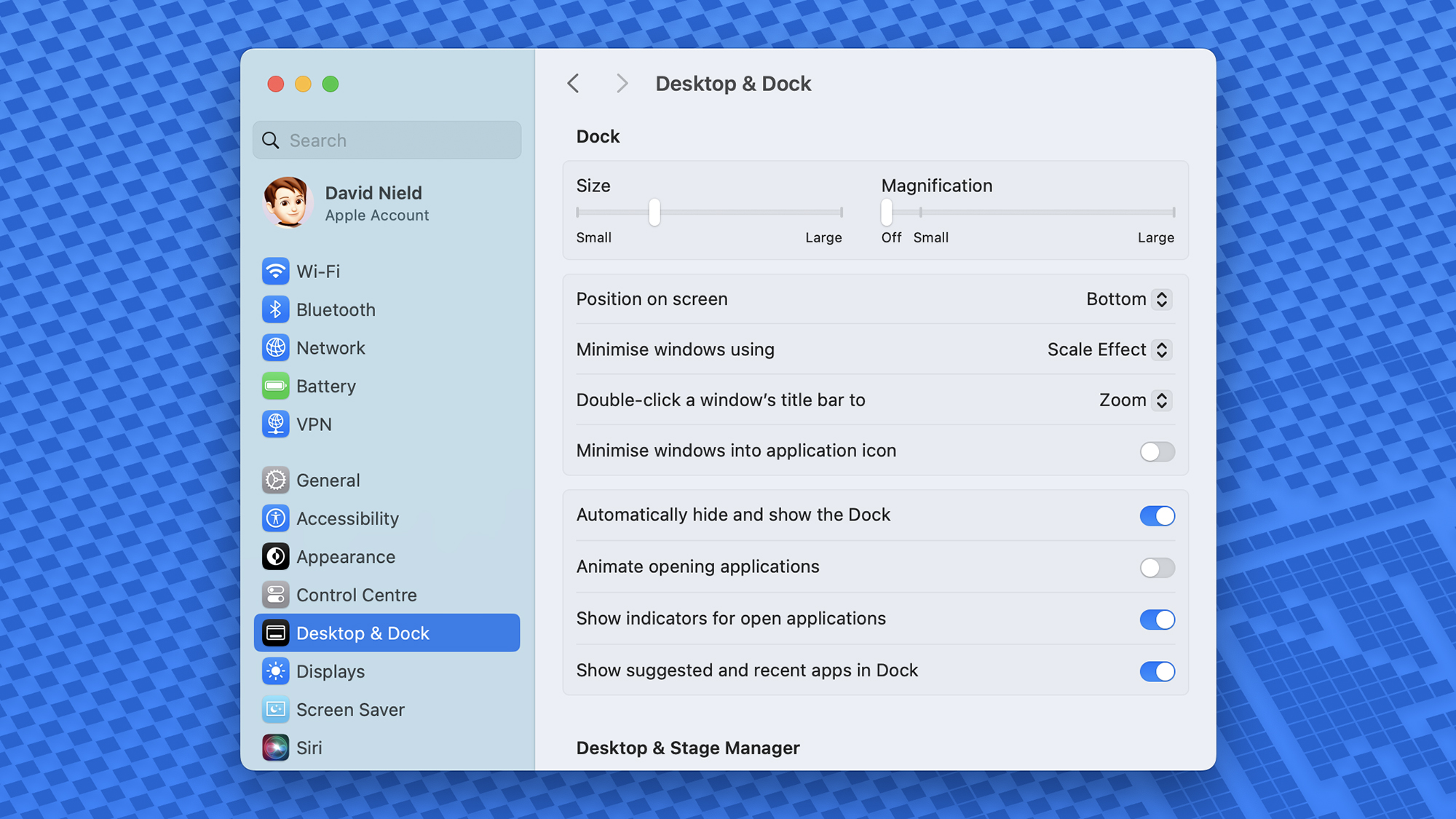Když přijde na pořádek v doku, máte několik dalších vestavěných nastavení macOS – otevřeteJablkomenu a poté vyberteNastavení systémua vybratDesktop & Dockvidět je. Zde můžete skrýt dokovací stanici, když se nepoužívá, skrýt navrhované a nedávné zkratky aplikací a zapnout nebo vypnout animace spouštění aplikací. Dok můžete také zvětšit nebo zmenšit.