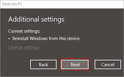 Krok 5: V okně „Reset this PC“ klikněte na „Next“ (Další).
