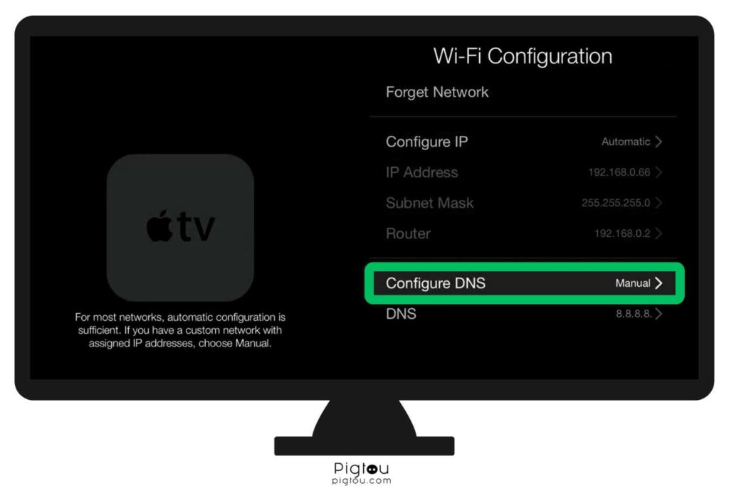 Nakonfigurujte nastavení DNS ručně na 8.8.8.8 / Obrázek: Pigtou.comPo úspěšné aktualizaci serveru DNS restartujte Apple TV.
