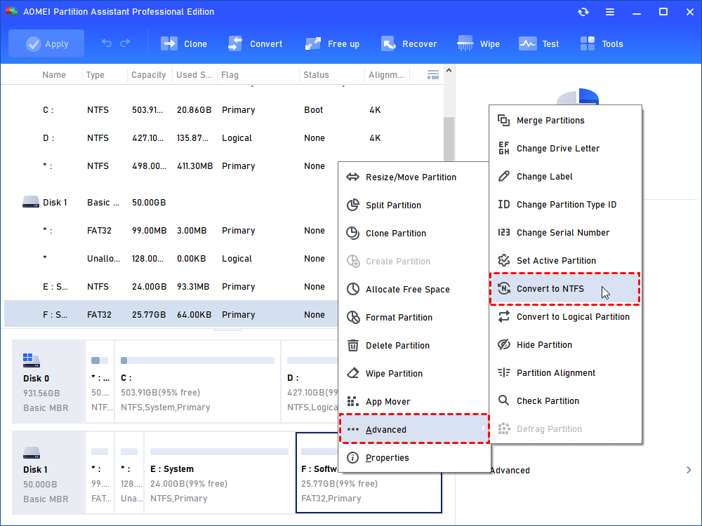 Krok 1Nainstalujte a otevřete aplikaci IEMOA Partition Assistant Professional. Klikněte na jednotku, kterou chcete změnit. Vyberte „Moderní“ pak „Převést na NTFS“.
