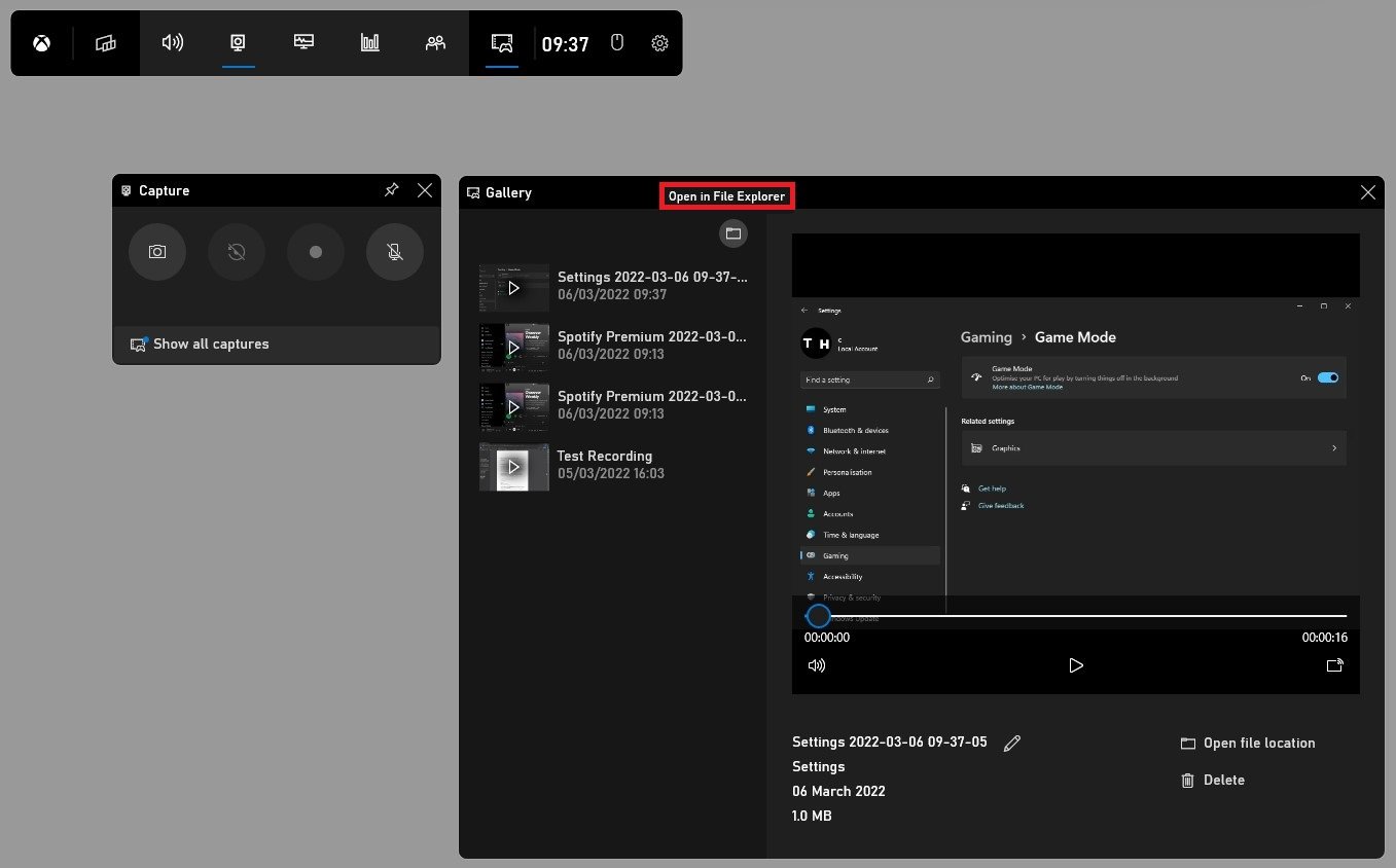 Chcete-li zobrazit náhled nahrávek a snímků obrazovky, vyberteZobrazit všechny snímky. Své snímky obrazovky najdete v této galerii a výběrem ikony složky se dostanete do složky, která obsahuje všechny vaše nahrávky.
