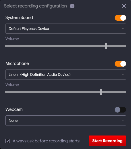 Krok 4 – Kliknutím na tlačítko Red Record zobrazíte konfigurační okno. Odtud si vyberte a zkontrolujte své preference, abyste se ujistili, že nástroj zaznamená vaši obrazovku a současně vás zaznamená přes webovou kameru a mikrofon. Ke zvýšení kvality videa můžete použít externí mikrofon a kameru. Budete muset zkontrolovat a zajistit, aby jej nástroj detekoval a zobrazil v seznamu dostupných zařízení.