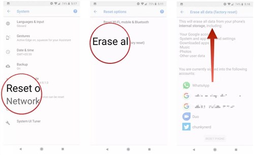 Krok 4: Tento krok není příjemný, ale zásadní. Jednoduše resetujte zařízení Android do továrního nastavení a obnovte zálohu. Chcete-li to provést, přejděte na „Nastavení“ > „Systém a zabezpečení“ > „Možnosti resetování“ > „Vymazat všechna data“ > „Resetovat telefon“. Nyní zadejte heslo svého telefonu a dokončete proces.