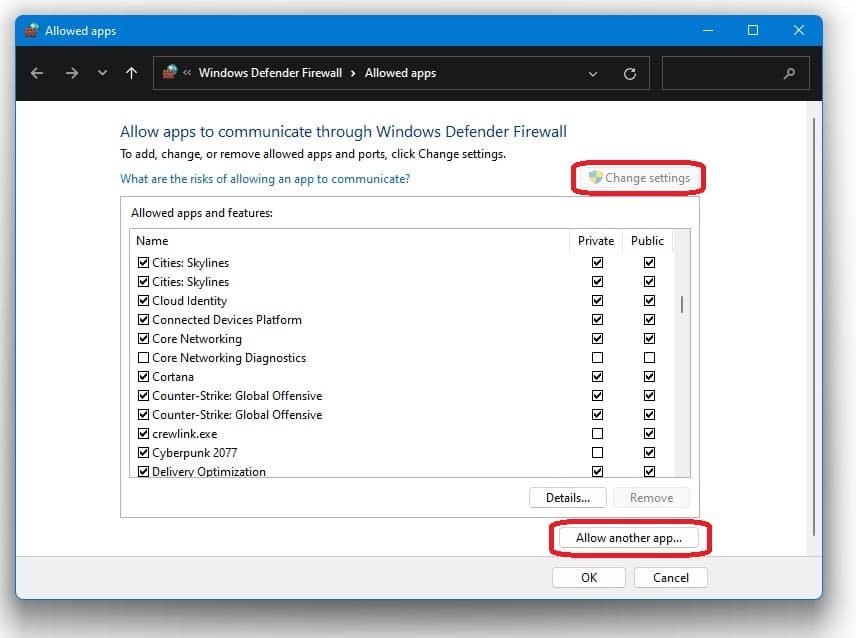 Vyberte „Změnit nastavení”aPovolit jinou aplikaci. VybratProhlížeta otevře se váš průzkumník souborů. Přejděte na jednotku, na kterou jste hru uložili,Programové soubory,raketová liga,dvojhvězdy,Win64, a zde vyberte aplikaci Rocket League a vyberteOTEVŘENO. To vám umožní vyloučit aplikaci z blokování vaší bránou firewall a zabráníte problémům se serverem pro Rocket Leauge.