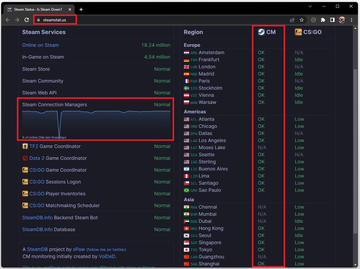 Ujistěte se, že servery Steam fungují správně. Chcete-li to provést, otevřete svůj oblíbený prohlížeč a přejděte nasteamstat.us. Na této stránce si můžete prohlédnout, zda jsou služby Steam online pro všechny oblasti serveru. Někdy není stav serveru k dispozici. PodSlužby Steam, měli byste také vidětSteam Connection Manager, obvykle se pohybuje na 99 % nebo 100 %.