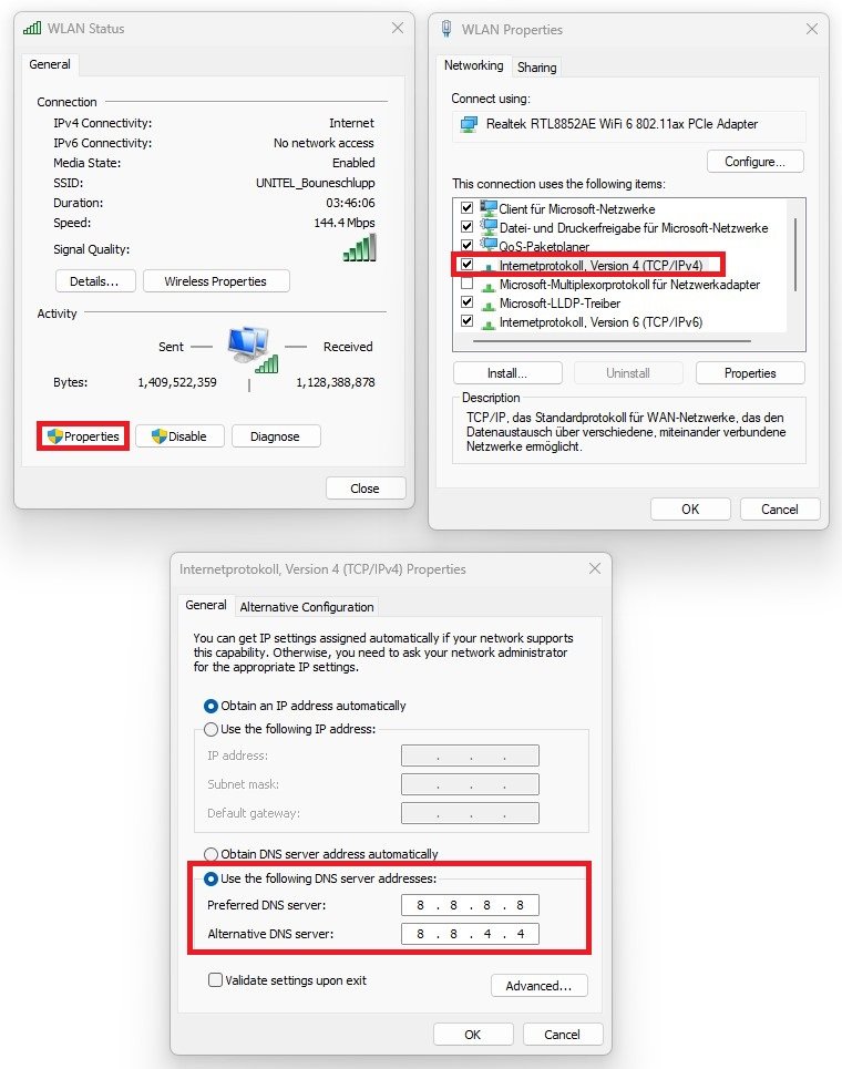 VybratVlastnostia nakonec poklepejte na ikonuInternetový protokol verze 4. To vám umožní změnit adresy serveru DNS. Vyberte, chcete-li použít následující adresy serverů DNS a pro vášPreferovaný server DNS, použijte: 8 8 8 8, a pro vašealternativní DNS server, použití: 8 8 4 4.