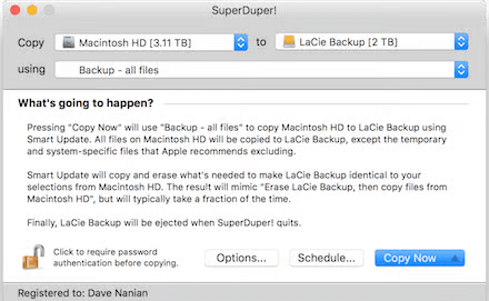 - Nabízí služby automatického zálohování – díky vestavěnému plánovači, který vám umožní nastavit čas, kdy má SuperDuper zálohovat vaše soubory ve vaší nepřítomnosti.