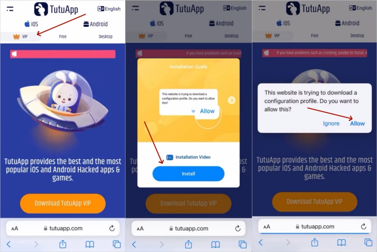 Krok 1ZadejteOficiální stránky TutuAppa vstupte do VIP sekce. Poté vyberte Stáhnout TutuApp VIP (nebo Stáhnout pro iOS).