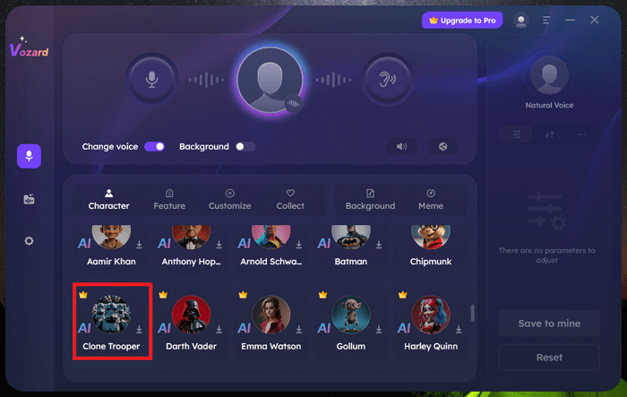 Krok 3:Uvidíte hlavní rozhraní Vozard. Jako výstupní hlas zvolte Clone Trooper.
