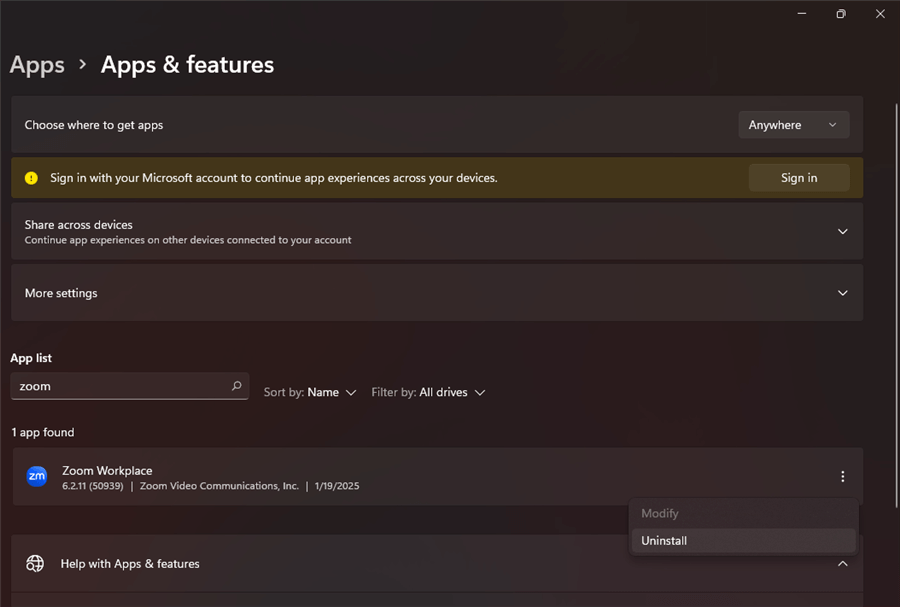 Krok 2Vyberte „Aplikace.V části Aplikace a funkce najděte Zoom. Klikněte naOdinstalovat“ a potvrďte.