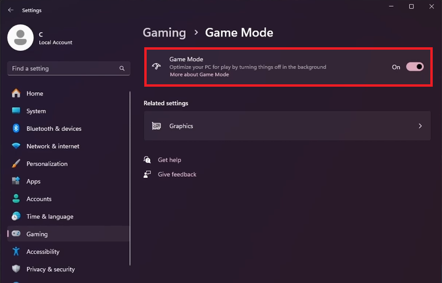 Gå til Windows-indstillinger, vælg "Gaming", og aktiver "Spiltilstand".