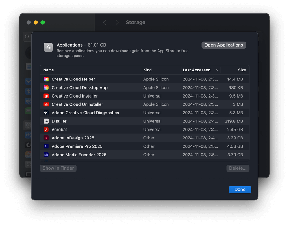 - ÅbnOpbevaringundersektion, og klik derefter på den lillejegikonet ved siden afAnsøgningerfor at se en liste over alle apps, der er installeret på din Mac.