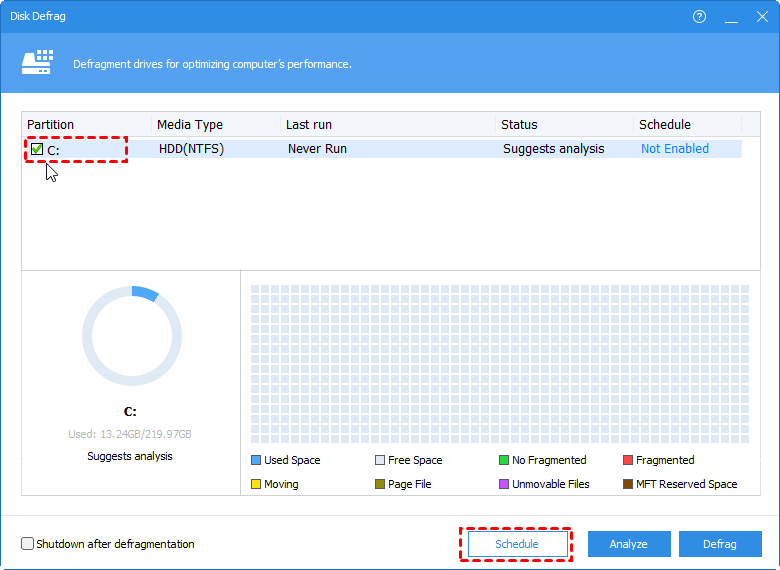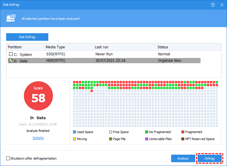 ✍I betragtning af forskellen mellem HDD og SSD, kan du ikke defragmentere SSD på denne måde. Hvis du har brug for at gøre det, så læs venligstdette afsnittil reference.