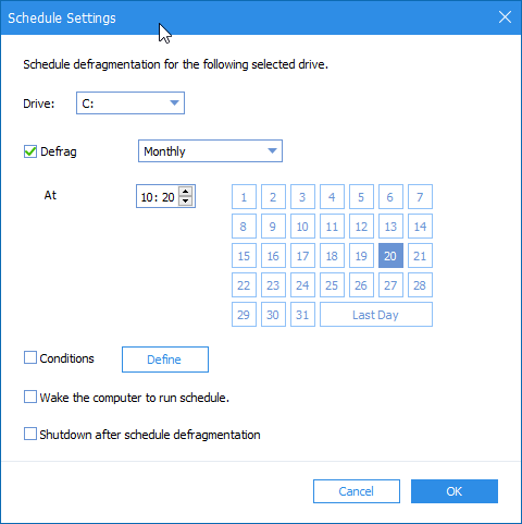 Trin 4. I det nye åbnede vindue skal du vælge det drev, du vil defragmentere, indstille den særlige tid til at defragmentere det, og klikke på "OK". Klik derefter på "Betingelser" for at indstille graden af defragmenteringen.