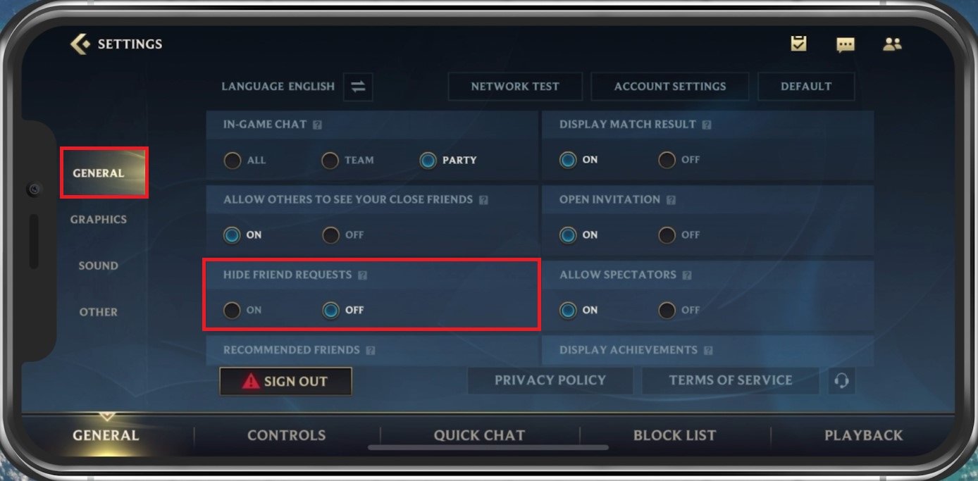 I denGenerelsektionen af dine Wild Rift-indstillinger skal du deaktivereSkjul venneanmodningervalgmulighed.