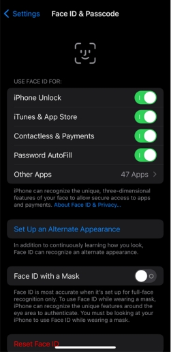 Face ID giver dig mulighed for at opsætte et alternativt udseende. Denne funktion tilføjer et ekstra lag af sikkerhed ved at forhindre en person med et lignende udseende eller et billede eller en video af dit ansigt i at låse din iPhone op.