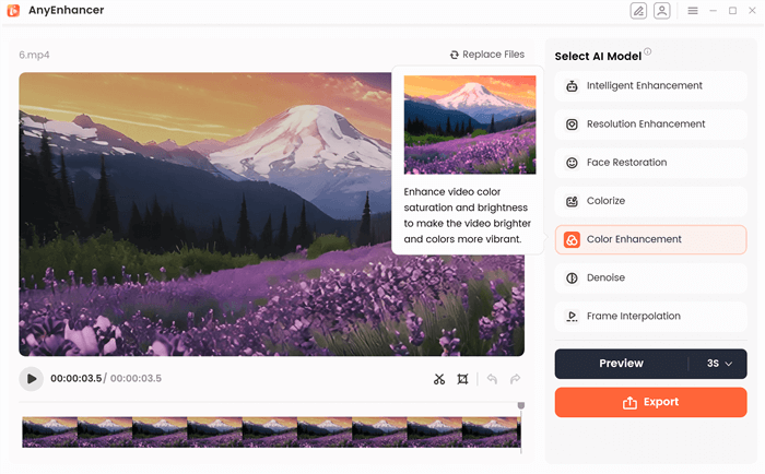 Ønsker du at forbedre din videokvalitet med sømløs farvekorrektion? AnyEnhancer tilbyder en AI-drevet farveforbedringsmodel, der forenkler processen og får dine optagelser til at se levende, afbalancerede og professionelle ud. Denne avancerede model analyserer hvert enkelt billede og justerer lysstyrke, kontrast og farvetemperatur for optimal visuel klarhed, perfekt til skabere, der ønsker levende og nøjagtige farver uden besværet med manuel redigering.