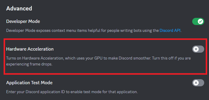 Når du har sorteret codec-indstillingerne, skal du gå til fanen "Avanceret" i dine appindstillinger. Deaktiver også indstillingen "Hardware Acceleration" her.