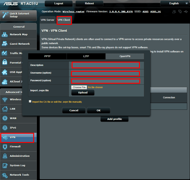- VælgÅbnVPN-fanenog udfyld følgende felter: