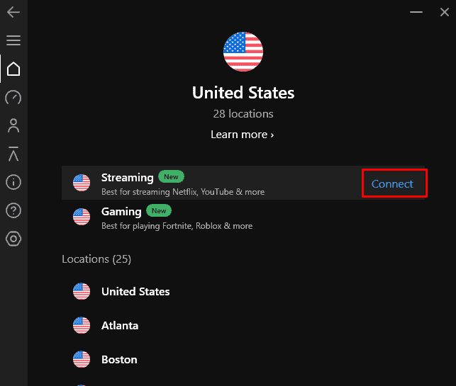 - Klik på "Beliggenhed” og vælg din foretrukne serverplacering. Hvis du vil have adgang til eksklusivt indhold i USA, skal du sørge for at vælge en tilsvarende VPN-server.