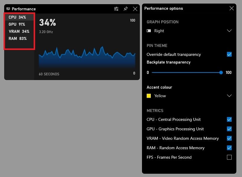 Hvis du vil forhåndsvise din CPU- og GPU-udnyttelse, mens du er i spillet, anbefales det at bruge din indbyggedeXbox Game Baroverlejring. Når du bruger genvejenWindows-tast + G, vil du være i stand til at fastgøre dette ydeevnevindue hvor som helst på din skærm, og når du bruger genvejen igen, forbliver den på din hovedskærm. Du kan forhåndsvise din CPU- og GPU-udnyttelse i procent og dit VRAM- og RAM-forbrug.