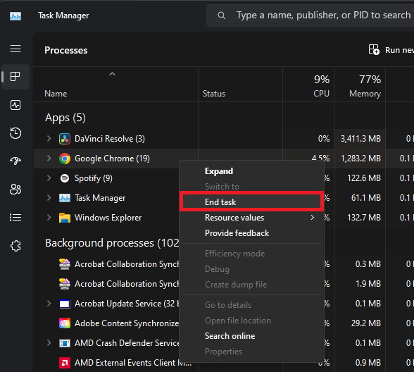 Task Manager > Processer > Google Chrome > Afslut opgave