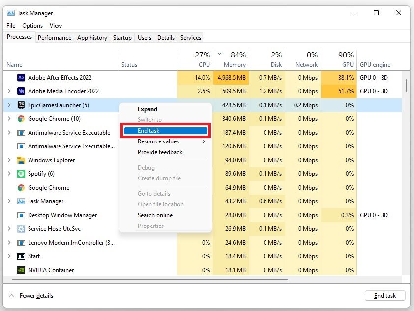 Task Manager > Processer > Epic Games > Afslut opgave