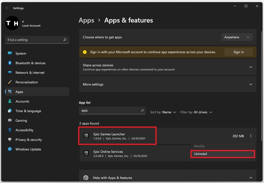 Du skal geninstallere Epic Games launcher på dit system som en sidste udvej. For at gøre det, søg efterAppsi din startmenu søg for at åbne dinApps og funktionervinduet med systemindstillinger. Filtrer efter alle drev og søg efter Epic Games. Klik til sidst på burgermenuen for dinEpiske spillauncher og vælgAfinstaller. Dette vil tage et minut at afinstallere Epic Games launcher fra dit system.
