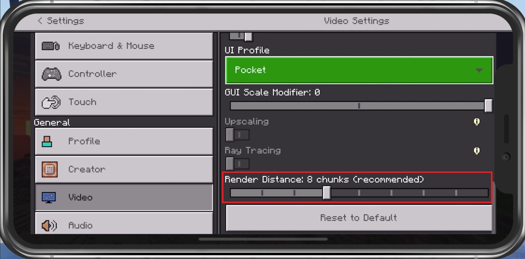 ForladeOpskaleringogRay Tracingdeaktiveret, hvis disse muligheder er tilgængelige for dig. Reducer dinGengiv afstandtil 4-7 bidder, afhængigt af din enheds ydeevne. Jo lavere du indstiller dette, jo mindre vil Minecraft Pocket Edition halte på din mobilenhed.