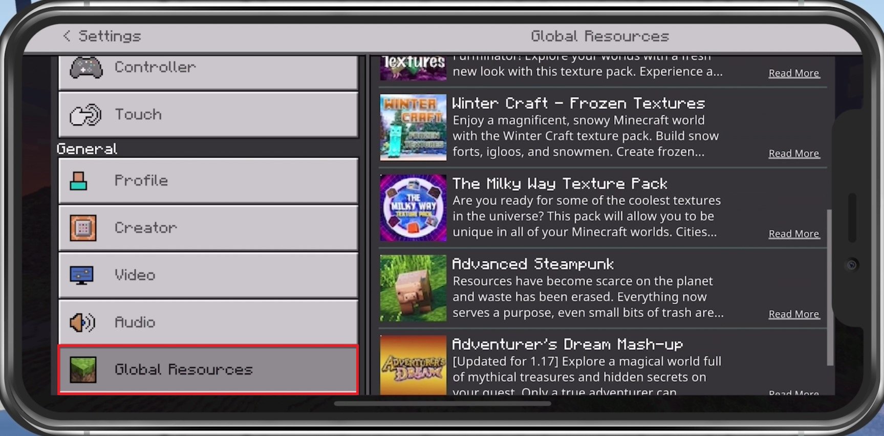 UnderGlobale ressourcer, vil du gerne bruge den officielleMinecraft teksturpakkeeller enhver anden letvægts teksturpakke for at sikre, at spillet ikke halter på din enhed.