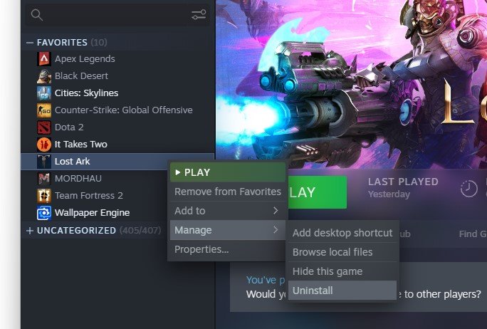 Sørg for, at dine spilfiler er komplette og aktuelle. Åbn dinDampbibliotek. Højreklik på Lost Ark og vælgEgenskaber.