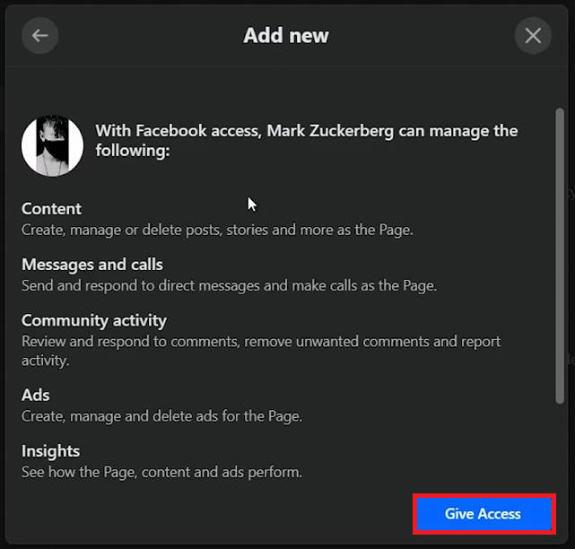 Du kan give denne person 'fuld adgang' til din side. Vær forsigtig, da fuld adgang giver dem mulighed for at foretage væsentlige ændringer, herunder at fjerne andre administratorer eller slette siden.