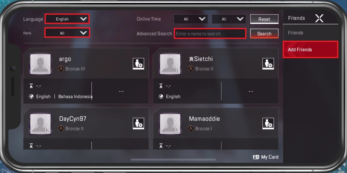 I denTilføj vennerfanen, kan du filtrere denne liste over brugere efterSprog,RangogOnline tid. I dinAvanceret søgning, kan du også indtaste brugernavnet for at finde en bestemt bruger.